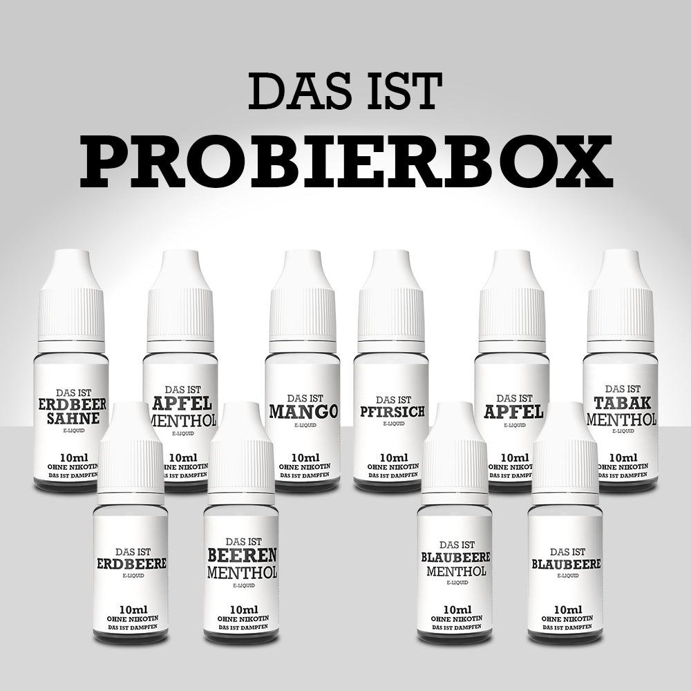 Mit großer Spannung erwartet können wir euch nun auch unsere zweite Probierbox von „Das ist Dampfen!“ anbieten. Denn: Das ist Dampfen hat zuwachs bekommen! Freut euch auf 10 neue Liquid Geschmacksrichtungen in 4 möglichen Nikotinstärken. Einfach die gewünschte Nikotinstärke auswählen, ab in den Warenkorb, Bestellung abschicken und die fixe Lieferung abwarten. Schon kann es losgehen. Ob Apfel, Blaubeere oder eine angenehme Tabak Menthol Mixtur, jedes einzelne „neue“ Liquid ist für euch einmal in der Komplettbox enthalten. Die Liquids sind allesamt direkt mit der Lieferung einfüllbereit für deine E-Zigarette und zum direkt losdampfen! Viel Spaß!